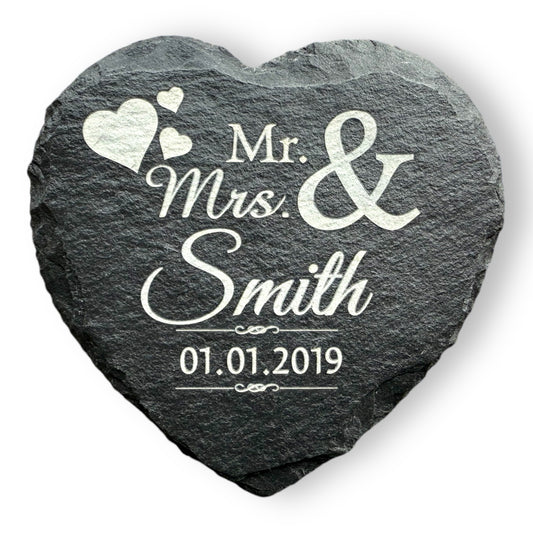 Engraved Heart Slate Wedding Coaster, Mr & Mrs with Hearts, Set of 2, Personalised